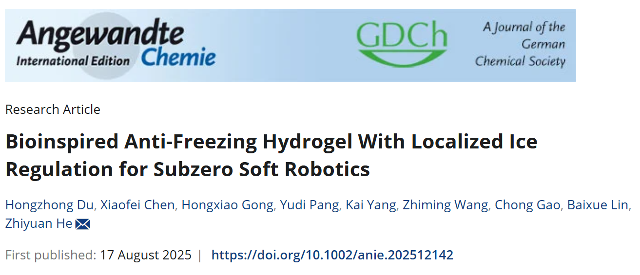 BETWAY必威贺志远教授课题组近日在仿生纯水系抗冻水凝胶材料助力机器人低温触觉识别领域取得重要进展。2025年8月,相关研究成果以“Bioinspired Anti-Freezing Hydrogel With Localized Ice Regulation for Subzero Soft Robotics”为题在国际知名期刊《Angewandte Chemie International Edition》上发表。BETWAY必威贺志远教授为论文通讯作者,博士生杜宏中和陈笑非教授为论文的共同第一作者。