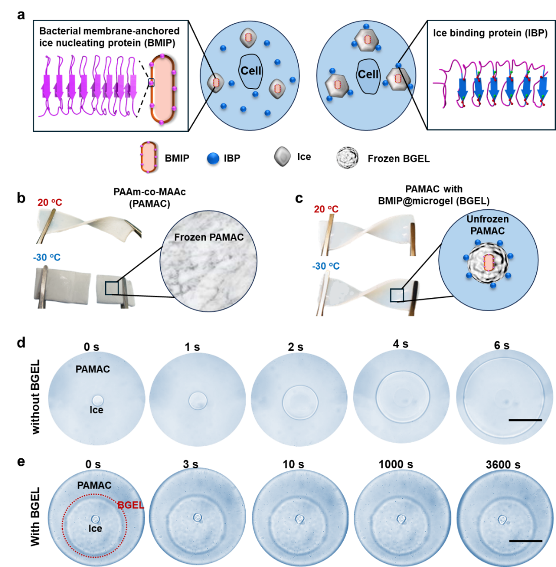 图1揭示该水凝胶的协同抗冻机制:BMIP在微球(BGEL)内促进冰早期成核,而IBP吸附于冰晶表面抑制生长。对比实验显示,普通聚(丙烯酰胺-共-甲基丙烯酸)(PAMAC)凝胶在-30℃脆化(图1b),冰晶6秒内蔓延整个网络(图1d);而含BGEL的样品低温下保持柔性(图1c),冰晶3600秒内被限制在微球内(图1e),实现"冰晶局部化"。