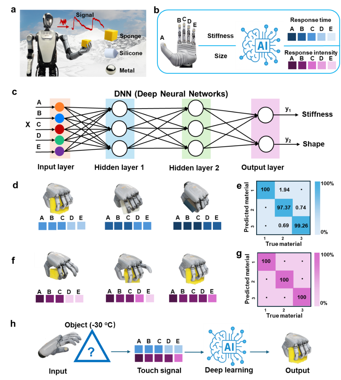 图6展示实际应用:集成水凝胶传感器的机械手在-30℃抓取物体(图6a-b),通过响应时间识别刚度(海绵/硅胶/金属准确率>97%,图6d-e),通过激活传感器数量判别尺寸(100%准确,图6f-g)。结合深度学习(图6c),系统成功实时识别8cm³海绵立方体(图6h)。