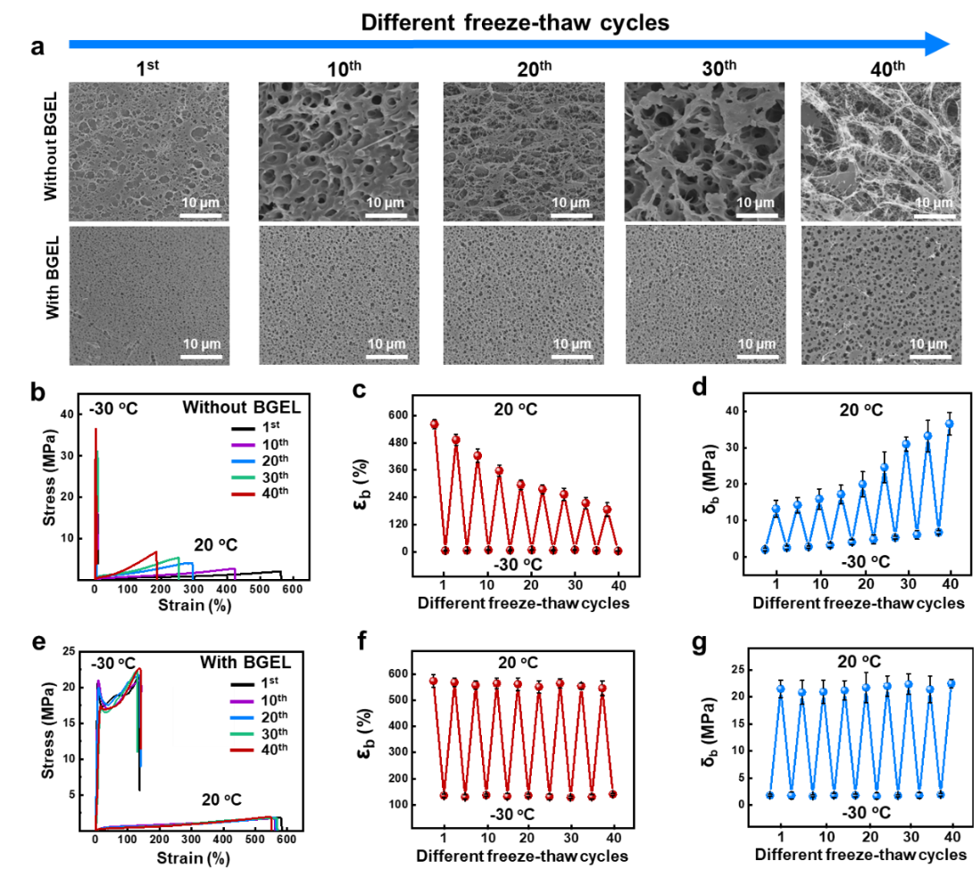 图4揭示BGEL的长期保护作用:普通PAMAC经40次冻融后结构碎裂(图4a),断裂强度波动超50%(图4b-d);而含BGEL样品形态完好(图4a),力学性能几乎无衰减(图4e-g)。