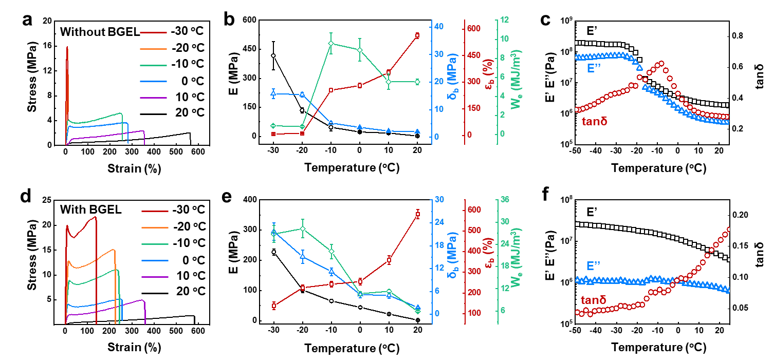 图3对比了低温力学行为:普通PAMAC在-30℃断裂应变骤降至7%(图3a-b),动态热机械分析(DMA)显示其储能模量飙升至1GPa(近冰的刚性,图3c);而含BGEL样品在-30℃仍保持138%延展性(图3d-e),储能模量仅26MPa(图3f),证明基质未冻结。优化实验表明10wt% BGEL含量使拉伸强度达21.7MPa。