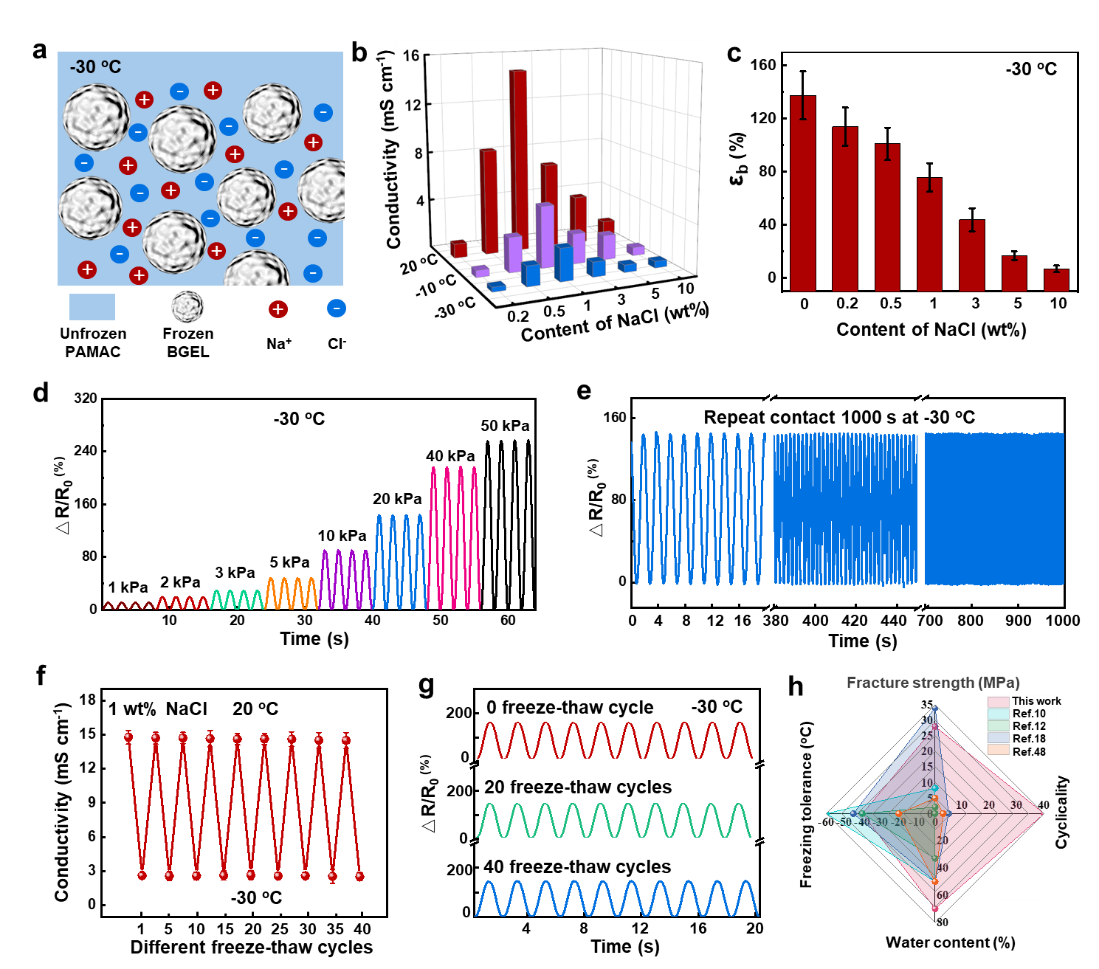 图5证实该水凝胶的导电稳定性:1wt% NaCl添加使电导率在-30℃达2.6 mS·cm⁻¹(图5b),归功于离子在未冻结基质中的迁移(图5a)。基于此的传感器在-30℃压力响应稳定(图5d-e),40次冻融后性能不变(图5f-g)。雷达图显示其综合性能(强度、冻融稳定性、含水率)超越传统抗冻凝胶(图5h)。