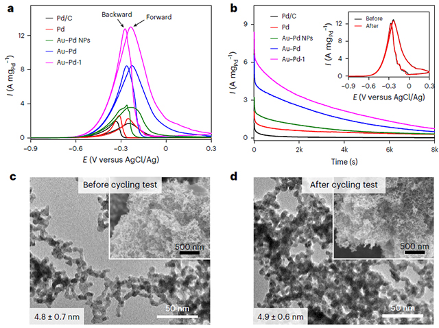 NMA基电催化剂在提供具有高导电性和丰富活性位点的连续自支撑3D网络方面具有优势,从而提供高活性和高稳定性。文中以乙醇氧化反应为例指出NMA的优异电催化性能(图6)。
