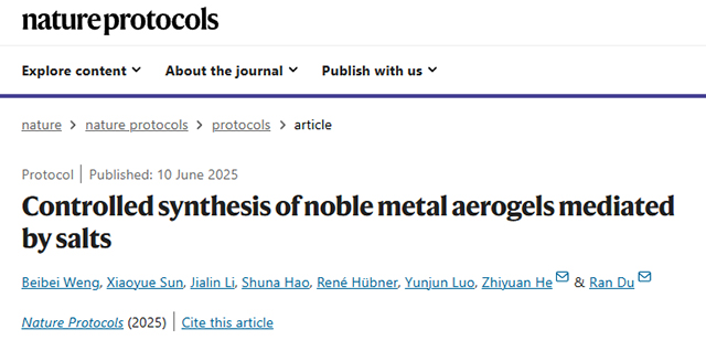 近日,BETWAY必威杜然教授团队和贺志远教授课题组合作,在金属气凝胶可控制备方面取得重要进展,相关成果以“Controlled synthesis of noble metal aerogels mediated by salts”为题在国际顶级期刊《Nat. Protoc.》发表(DOI: 10.1038/s41596-025-01185-1)。必威西汉姆联2022级博士生翁蓓蓓为第一作者,杜然教授、贺志远教授为论文共同通讯作者。