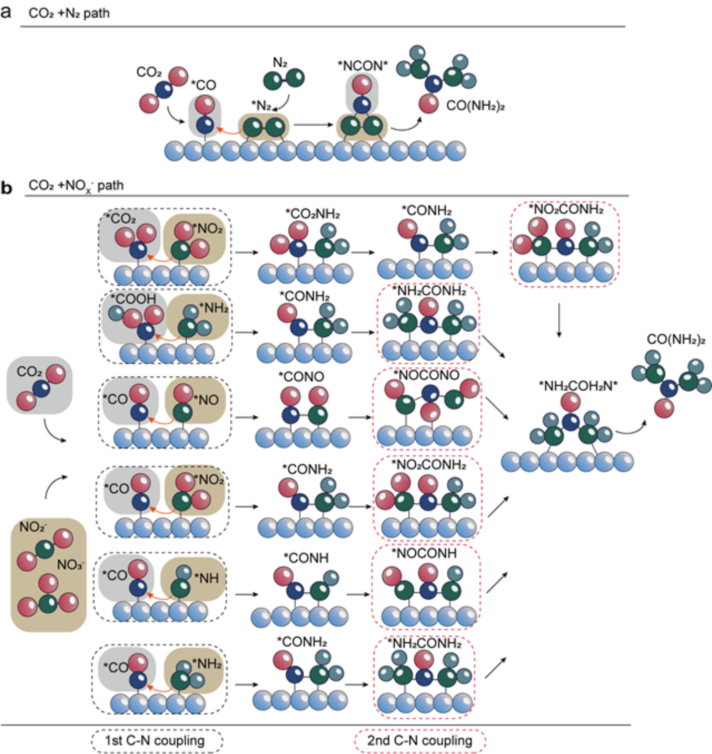 图2. 电催化尿素合成的C-N耦合机制:(a) N2 + CO2路径和(b) CO2 + NOx⁻路径。