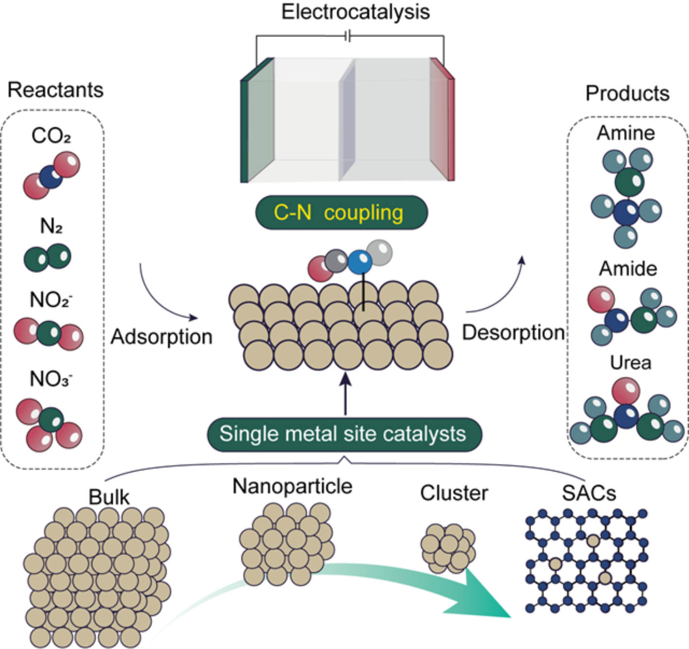 构建C-N键合成酰胺类和胺类化合物在医药、化工、农业和能源等各个领域具有重要应用。传统的合成方法依赖化石资源,通常在高温、高压条件下进行,具有高能耗、高排放的特点。开发绿色、温和的碳氮键制备方法十分迫切。基于可再生电力的电化学过程提供了一种可持续的、温和的反应途径来实现C-N耦合,如二氧化碳还原反应(CO2RR),氮还原反应(N2RR)和硝酸盐还原反应(NO3-RR),为C-N偶联系统开辟了新的途径。在一个典型的电化学CO2-N2/NO2⁻/NO3⁻(CNRR)反应中,二氧化碳和氮的共同还原经历一个复杂的反应路径,包括多电子转移过程,包括C="O和N=O/N≡N键的断裂,以及随后生成的碳和氮中间体的C-N耦合。在许多相互竞争的反应途径中实现高效的C-N偶联提出了重大挑战。迄今为止,尽管在各种纳米催化剂和诸多单金属位点催化剂(SMCs)方面取得了重大进展,但缺乏对大量催化剂结构-活性关系和机制理解的总结。因此,本文综述了电催化C-N偶联中从纳米催化剂到SMCs的最新进展,介绍了二氧化碳和氮化合物的共还原制备尿素、胺和酰胺的研究状态,重点分析了C-N偶联机理、金属活性和配位环境对性能的影响,阐明了结构-活性关系。(图1)