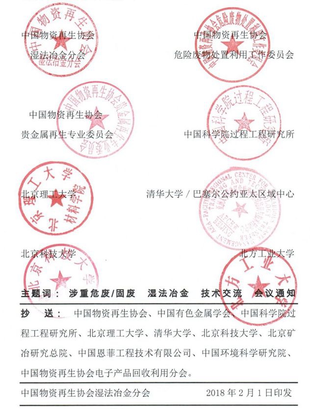 为了促进涉重危废行业资源化利用技术的绿色、规范、持续、健康发展,实现涉重危废行业的金属再生、保障国家金属安全,中国物资再生协会湿法冶金分会联合全国知名高校、科研机构和涉重危废产处单位,于2018年6月15-17日在北京召开“2018涉重危废/固废资源化利用学术研讨和技术交流会”。