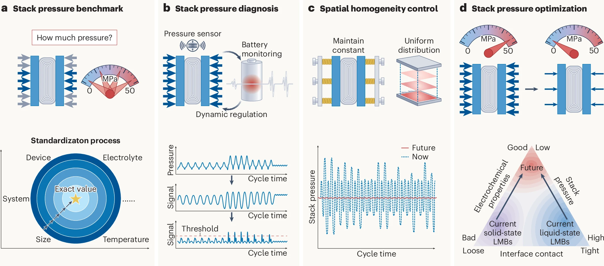 面向未来,研究团队提出四大研究方向:建立压力标准、开发堆叠压力诊断方法、控制空间均匀性、以及优化堆叠压力使用数值(图6),特别是在电动汽车等大规模应用中,如何将固态电池的工作压力从目前的数百MPa降低到0.1 MPa以下,将成为实现固态电池商业化的关键突破点。