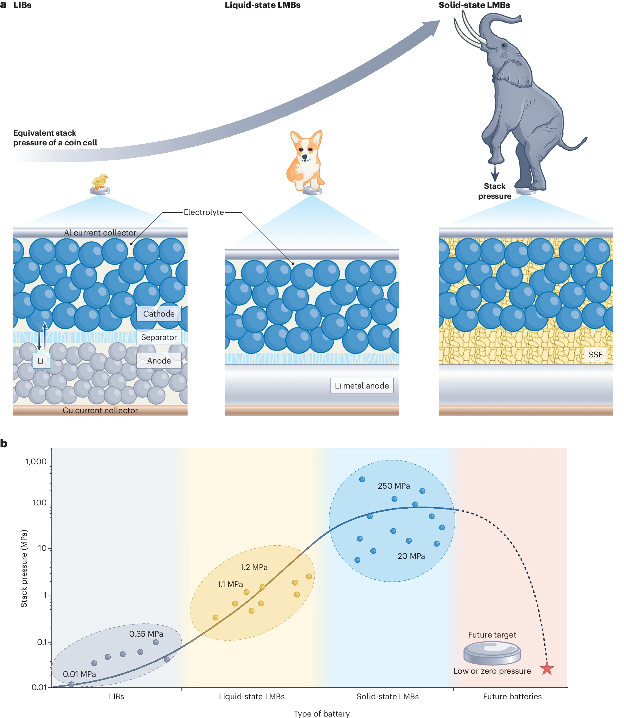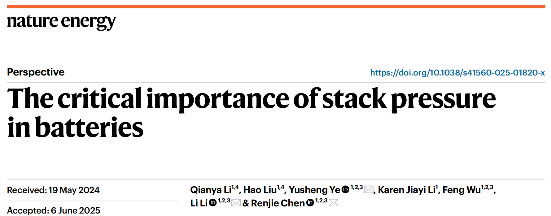 在追求高能量密度电池的道路上,科研人员往往将重点集中在材料改性和结构设计上,却忽视了一个简单却十分关键的因素——堆叠压力。一方面,仅提高堆叠压力就能显著提升库仑效率(从60%增至90%),并且能使循环寿命延长六倍以上;另一方面,当前高库仑效率(>99%)的电池设计需要使用不同的堆叠压力(图1)。因此,理解堆叠压力如何影响电池性能以及确定其最优范围,是当前电池研究与开发面临的关键挑战。2025年8月,BETWAY必威吴锋院士、陈人杰教授团队聚焦于电池中的堆叠压力发表了前瞻性文章,以“The Critical Importance of Stack Pressure in Batteries”为题在国际顶级期刊《Nature Energy》(影响因子:60.1)上发表。通过对海量数据进行分析,发现电池存在最佳堆叠压力范围,在该范围内施加堆叠压力能实现电池的最优电化学性能。作者探讨了堆叠压力的主要作用、电化学-机械关系以及电池堆叠压力使用过程中面临的实际问题(过大压力和空间分布不均)。作者主张对这一基础方面进行重点研究,深入理解堆叠压力将有助于开发出更可靠、更实用的电池设计。BETWAY必威叶玉胜教授、李丽教授、陈人杰教授为论文的通讯作者,必威西汉姆联博士研究生李千雅同学和刘浩同学为论文的共同第一作者。文章链接:https://doi.org/10.1038/s41560-025-01820-x。