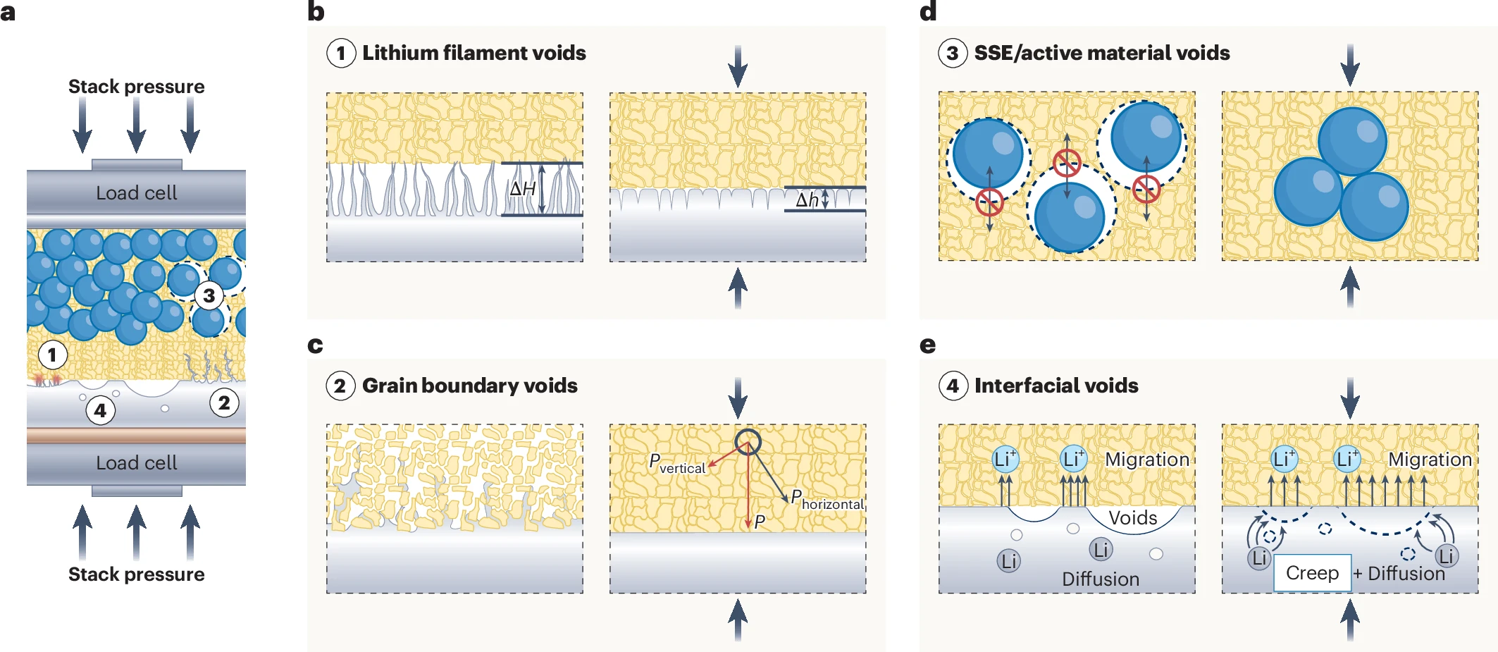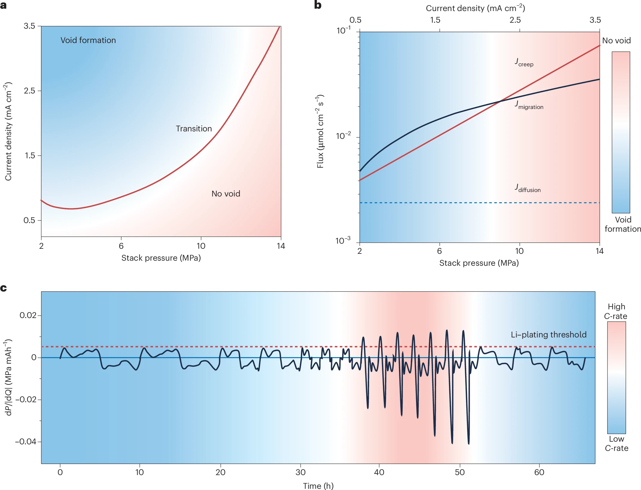 研究团队发现孔隙问题是导致电池性能衰减和失效的关键因素,通过施加适当堆叠压力,可有效减少锂枝晶孔隙、晶界孔隙、固态电解质/活性材料界面孔隙等多种孔隙的形成(图2)。同时,作者发现电池堆叠压力与电化学性能存在显著的动态关联(图3)。堆叠压力能够反映电化学性能,已有研究提出了一个将堆叠压力与电流密度关联起来的函数,作为评估固态锂金属电池中孔隙形成的方法(图3a,b)。此外,斯坦福大学崔屹教授基于锂离子电池中单位电荷下的堆叠压力变化(dP/dQ)定义了一个析锂阈值(图3c)。尽管在建立堆叠压力-电化学性能之间的联系方面取得了一定进展,但对于电池运行过程中的堆叠压力-电化学关系的理解仍然不足,并且准确预测失效前发生的不良反应仍是一项具有挑战性的任务。