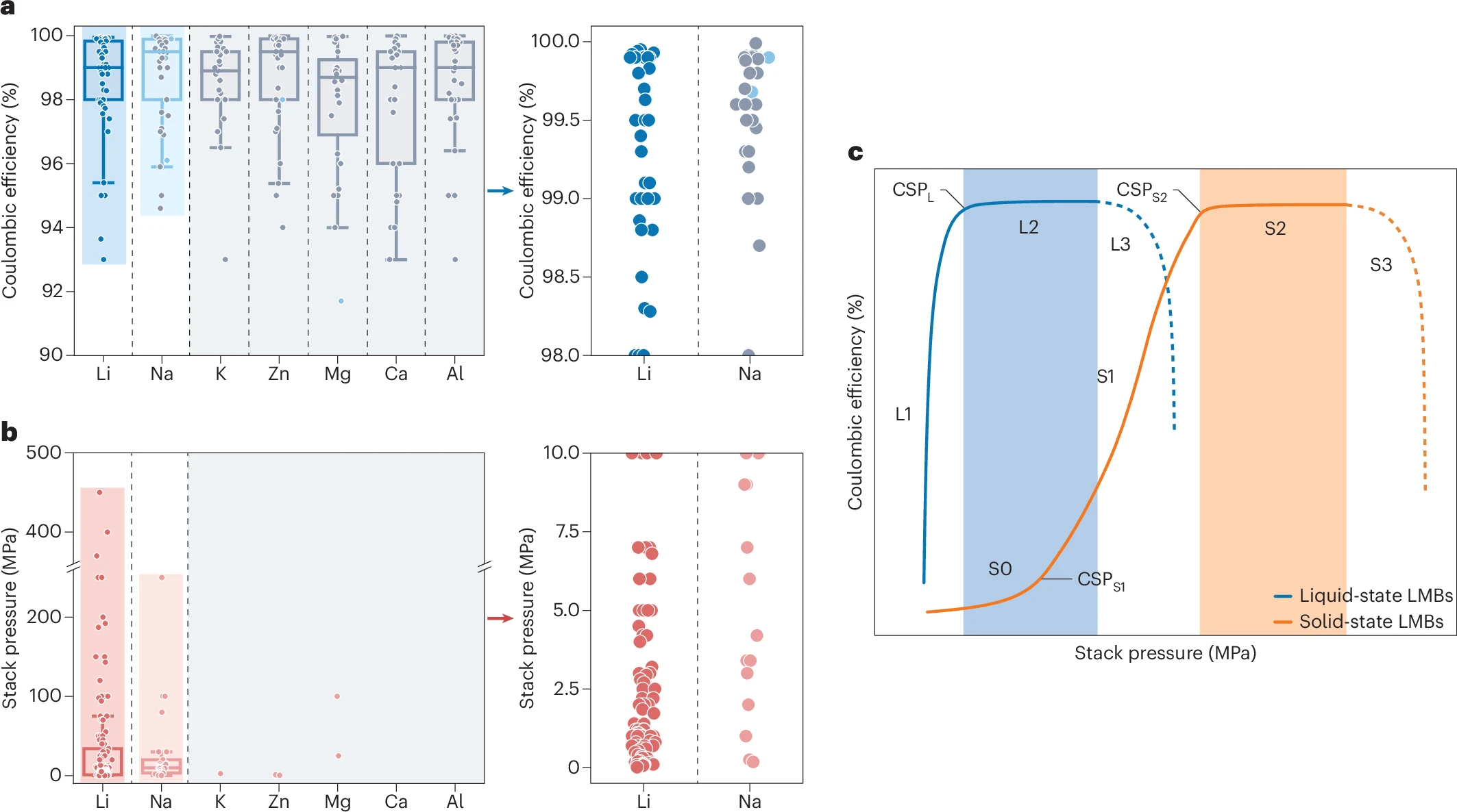 论文分析了不同电池系统中电池库仑效率(图5a)和堆叠压力(图5b)的统计数据,总结出如图5c所示的“临界堆叠压力(CSP)”经验模型,其阐明了液态或者固态锂金属电池中库仑效率和堆叠压力之间的关系。液态锂金属电池的CSP经验模型包含L1(库仑效率随压力上升至CSPL达到峰值)、L2(库仑效率平台期)和L3(过压失效)阶段;固态锂金属电池的CSP经验模型则包含额外的S0阶段(需要高初始压力CSPS1启动电池),随后是S1(库仑效率上升至CSPS2达到峰值)、S2(库仑效率平台期)和S3(过压失效)阶段。CSP经验模型为确定实用堆叠压力提供了重要依据,在CSPL或CSPS2处达到高库仑效率水平的最小堆叠压力,可作为电池设计原则的重要指导方针。