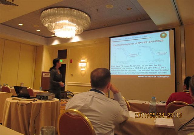 在我校2011年“985工程”一期国际交流与合作建设项目资助下, 我院杨荣杰教授、郝建薇教授(阻燃材料研究国家专业实验室、火安全材料与技术教育部工程研究中心)应邀于2011年5月22日至25日在美国Stamford参加了第22届国际阻燃聚合物材料进展年会(22nd Annual Conference on Recent Advances in Flame Retardancy of Polymeric Materials),并分别在会上作了题为“聚苯基硅倍半氧烷(PPSQ)阻燃聚碳酸酯复合材料”、“无机填料对膨胀型防火涂层燃烧及热分解行为的影响”的口头报告,受到与会代表的关注,显示了我校阻燃材料学术研究的水平。