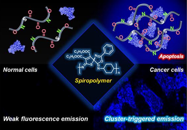 近日,在国家自然科学基金重大项目(批准号:21490574)和面上项目(批准号:21474009和51673024)资助下,BETWAY必威董宇平课题组与韩国高丽大学Kim Jong Seung课题组合作,报道了利用肿瘤细胞中高表达的MDM2蛋白与非传统共轭的螺环聚合物结合,在产生“簇”发光的同时,限制p53与MDM2蛋白结合,从而释放并活化p53蛋白,促进了癌细胞凋亡,实现对肿瘤细胞靶向诊断和治疗的相关工作。