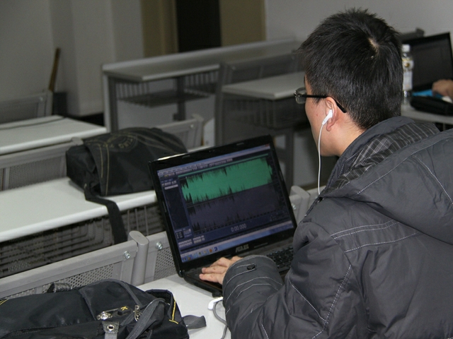分享过程中,柏泽龙同学为大家简单介绍了会声会影X4软件的使用基础,并通过实例为大家展示了该软件的使用流程,让同学们大开眼界。范斌同学同样先对cool edit软件作了简单介绍,接着以其丰富的音频处理经验为我们展示了该软件在音频处理方面的强大功能。同学们或详细聆听,或在自己的电脑上实际操作,期间两位嘉宾就大家的问题都进行了细心解答。