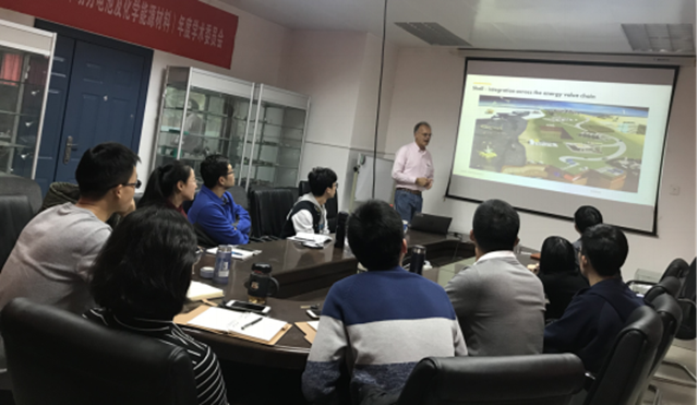 荷兰皇家壳牌集团(Royal Dutch /Shell Group of Companies),是目前世界第一大石油公司,总部位于荷兰海牙和英国伦敦,由荷兰皇家石油与英国壳牌两家公司合并组成,是国际上主要的石油、天然气和石油化工的生产商,同时也是全球最大的汽车燃油和润滑油零售商。Alexander van der Made博士此行主要为同学们介绍了当前全球面临的环境问题,能源危机以及对可持续发展的二次能源的迫切需求。与同学们分享了利用当前最便宜易得的可再生能源太阳能配合清洁的二次电池能源实现一系列的能源转化,最终获得化学能源,缓解能源短缺等问题的新型能源转换策略。随后,Alexander博士针对同学们提出的问题做了详细的解答,并鼓励同学们坚持做好二次电池关键材料的相关研究。