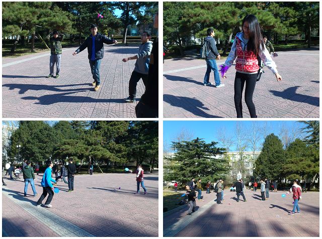座谈会结束,同学们便前往中心花园进行了“80、90”大众体育活动。对于已经好久没有参加集体性体育活动的同学们来说,这是一次难得的锻炼机会,大家都非常珍惜这次机会,带着高涨的热情开展了本次体育活动。有的同学围成一圈踢毽子,有的同学在一起丢沙包,还有的同学练习少有接触的板球,现场被笑声和快乐的气氛充满。