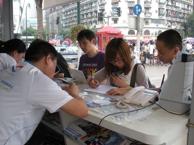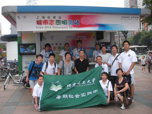 当天下午,实践团成员又来到上海最繁华的人民广场,在地铁出口处的世博志愿者岗亭处与当地志愿者共同交流,并邀请路人参与问卷调查。