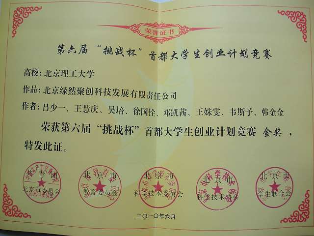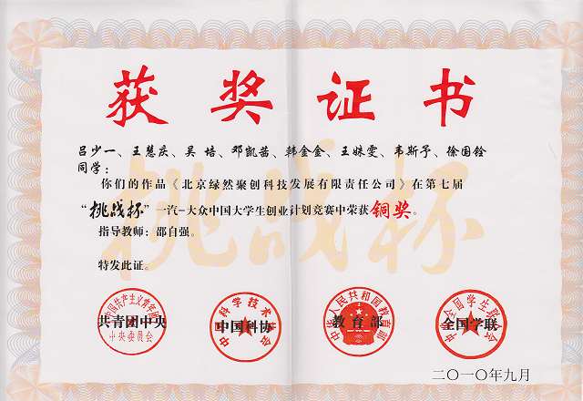 2010年9月29日晚,第七届“挑战杯”中国大学生创业计划竞赛闭幕式暨颁奖晚会在吉林大学隆重举行,来自必威西汉姆联的“绿然聚创”团队喜获铜奖。