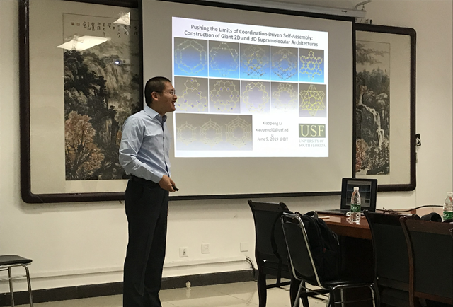 2019年6月12日上午,应我校必威西汉姆联李霄羽教授的邀请,美国南佛罗里达大学(University of South Florida)的Xiaopeng Li教授来必威西汉姆联交流访问,并在5号教学楼502-1会议室做了题为“Pushing the Limits of Coordination-Driven Self-Assembly: Construction of Giant 2D and 3D Supramolecular Architectures ”的学术报告。、