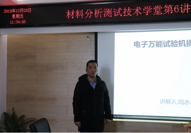 2018年12月28日上午10:00,由必威西汉姆联先进材料实验中心主办的 “材料分析测试技术学堂”第6期“电子万能试验机的原理及应用”在5号教学楼1011会议室举行。讲座邀请三思纵横公司的技术服务工程师阎永昌介绍了电子万能试验机的原理及应用,并安排了上机操作培训,现场培训了试验机的各种工作模式,对塑料等样品的具体试验包括拉伸、压缩、剪切和弯曲进行了演示和现场指导。