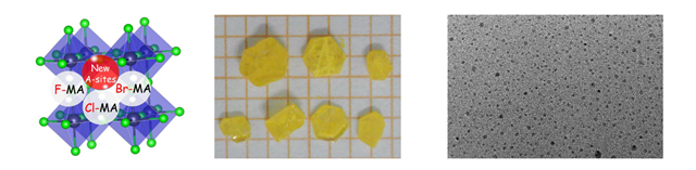 图1. 卤代铵盐及其钙钛矿三维结构示意图,FMAPbBr3钙钛矿单晶和FMAPbBr3钙钛矿量子点