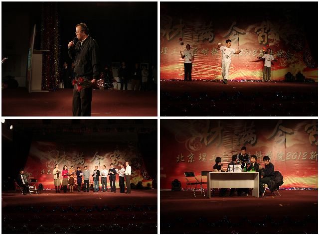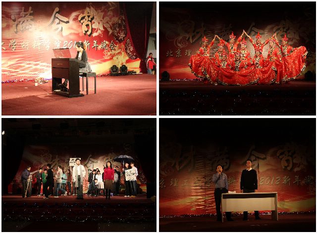 本次晚会,汇集了歌曲串烧、舞蹈联跳、师生自创小品、相声、诗朗诵、音乐剧等多种节目形式,蕴含着师生们的动人情感与卓越才华,展现了材料一家人的大主题。晚会以来自校艺术团的双排键表演开场,虽是单人演奏,但却如同交响乐般的效果震撼了全场观众。女教师们的蒙古舞、08级材化专业的师生音乐剧、刘颖等六位老师的歌曲串烧等师生自创节目不断将现场气氛推向高潮,同学们看到了平时严肃的导师们在舞台上也有魅力四射的一面。晚会还邀请到了来自北京林业大学的爵士舞表演、我校大艺术团的民族舞表演、我校空竹协会的空竹表演、理教101乐队的live show等,这些节目令人目不暇接,是一场真正的视听盛宴。阻燃材料课题组杨荣杰教授领衔的小品博得了满堂彩,杨老师与几位弟子表演生动,妙语连连,令人捧腹。教师小合唱《山楂树之恋》将大家带回到了那些逝去的岁月,感怀过往,珍惜眼前。