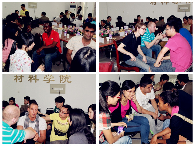 十几名留学生来自不同国家、不同种族、不同专业,他们的到来引起了同学们强烈的好奇心和兴趣,大家用热烈的掌声表示欢迎。活动开始后,留学生围坐一圈,中国学生围绕着留学生围坐一圈,双方按照桌子上摆放的话题板或任选话题用英语进行一对一的愉快交流,每轮交流为六分钟,六分钟后中国学生呈顺时针方向移动到一个位置,与下一位留学生继续交谈。新颖的互动方式调动了全场的气氛,现场沸腾起来,大家在表达友好的同时尽情交流,时而全神贯注,时而热情谈笑,氛围既轻松又热烈。