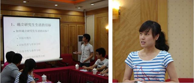硕士二年级的刘杰同学作了“如何规划研究生生活”的专题报告,围绕“确立研究生生活的目标”和“实现研究生生活目标的方法”两个方面展开了详细论述。硕士一年级的王柳同学从另一个侧面为大家介绍了关于规划研究生生活方面的体会,对“我是谁”、“我来做什么”和“我到哪里去”三个问题进行了阐述。