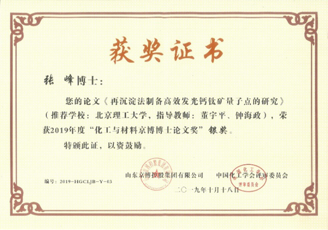 2019年10月17日至20日,2019中国化工学会年会在滨海城市山东青岛召开。在此会议上,2019年度化工与材料京博博士论文奖举行了隆重的颁奖仪式,我院2018届博士毕业生张峰斩获银奖,为必威西汉姆联在学会优博的荣誉榜上增添了亮丽的一笔。本次所获银奖的博士论文题目是“再沉淀法制备高效发光钙钛矿量子点的研究”,指导教师是董宇平教授和钟海政教授。