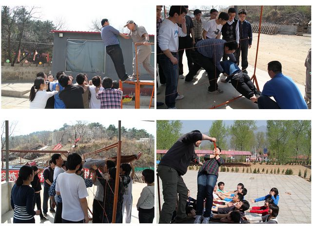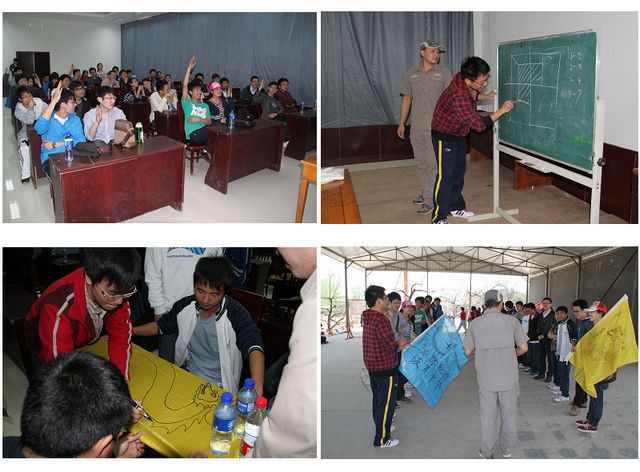 素质拓展活动开始之前,教练首先通过几个小游戏,让学员们体会到沟通、信任、协作的重要性。然后学员被分为两组,在各自队长的带领下,大家集思广益,出色完成了团队的基本建设,创建了队名、口号、队歌和队旗并进行了团队展示。