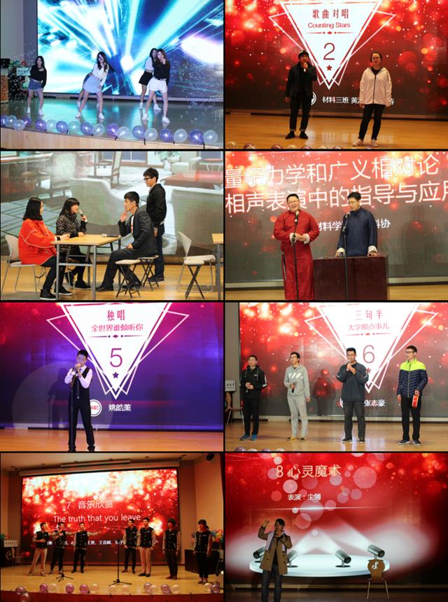 晚会在由一支舞蹈串烧拉开序幕,点燃了全场观众的热情,也奠定了整场晚会欢快的基调。接下来的男女对唱《Counting Stars》则唤起了大家内心深处的感动。随后,在09011602班全体同学共同带来的话剧《初心》中,同学们用朴实的语言展现了不忘初心、方得始终的人生哲学,也表达了我们无论身处何地、身居何位,都不忘初心的朴素愿望。在意味深长的话剧之后,科技协会带来的相声表演《论量子力学和广义相对论在相声表演与创作中的指导及应用》则将大家带向欢乐的海洋,捧逗俱佳,诙谐逗趣,让现场观众不时捧腹大笑。后来的情歌独唱《全世界谁倾听你》,由美女主持姚皓薰带来,引起大家的深深共鸣。三句半《大学那些事》,在张志豪等四位同学的诙谐演绎下,将同学们生活中的点滴乐事表现的活泼生动。由徐子铭等七位同学带来的音乐表演《The truth that you have》,则将钢琴、B-box及人声伴唱结合在一起,形式独特,效果震撼,也将材料人的艺术才华展现得淋漓尽致。而尘翊为大家带来的两套心灵魔术,则为大家展现了魔术的神奇,从现场观众的阵阵惊呼便可见一斑。