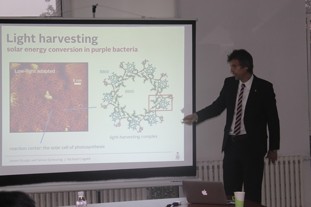 聘任仪式结束后,Gregory Scholes教授为我校师生做“Lessons from Nature about Solar Light-Harvesting”的精彩学术报告,学术报告由微纳中心常务副主任邹炳锁教授主持,Scholes教授详细介绍了自然界光吸收光体系的研究进展和他在量子尺度上对其吸收过程的理解。刘颖教授、曹传宝教授、庞思平教授、董宇平教授、张小玲教授、杨盛谊教授、张加涛教授以及材料、化学等相关学院的青年教师和学生参加了本次报告,并就相关问题与Scholes教授开展了深入的讨论。此次,Scholes 教授在我校进行为期一周的学术访问,另就“纳米晶材料研究”和“学术论文写作”为我校师生的做两次报告。