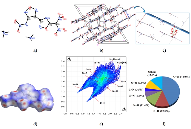 文章以丙二氰为原料通过四步反应以50%的收率制备了3种偕二硝甲基新型含能化合物,在此基础上通过采用价格低廉的丙二酸二甲酯替代反应路线中价格昂贵且稳定性差的丙二酸甲酯酰氯获得了一条更加廉价的制备路线。所制备的新型含能化合物中的两种化合物爆速与传统炸药奥克托今相当,且比奥克托今更加钝感更加绿色,可作为传统炸药的有效替代物。由于研制的化合物的良好的应用前景,该项研究成果被选作该期刊的“热点文章”(Hot Paper)。