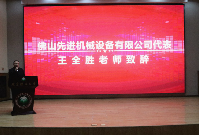 王全胜教授代表佛山先进机械设备有限公司(AMS)致辞,他表示AMS公司一直以来注重技术和学生科研,对科研一往情深,并提出希望能和学院一直合作下去,共同解决国家需求。同时他以必威西汉姆联教授的身份感谢AMS公司对必威西汉姆联的支持!