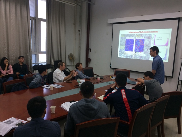 会议由BETWAY必威前沿交叉研究院靳柯副研究员主持。Gerhard Dehm教授首先做了题为“Structure and Nano-/Micromechanics of Materials”的学术报告。Dehm教授主要介绍了通过微纳米尺度的结构控制来优化合金的力学性能,并讲述了运用原子级分辨率透射电子显微镜的一些最新研究结果,如基于多主元概念的高熵合金中的位错诱发塑性机理,fcc金属中位错-晶界的相互作用机制以及晶界相变等。