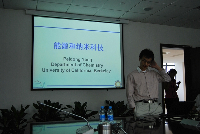2009年8月3日,苏州纳米所研究楼的会议室里气氛异常热烈。因为今天,国际著名科学家杨培东教授将在这里为暑期学校的学生们作学术报告。杨培东教授现为美国加州大学伯克利校(University of California, Berkeley)的终身教授,也被苏州纳米所聘为客座教授。杨教授学术报告的主题为能源与纳米科技。他讨论了在当今能源危机急剧明年的态势下,两种行之有效的能源问题解决方案:太阳能电池与水解制氢气。在这两个方案中他着重介绍了自己的课题组正在着重研究的太阳能电池。这种太阳能电池是尤基于纳米技术的InGaN薄膜制成的。杨教授也介绍了自己课题组的努力目标,即为将太阳能电池的太阳能利用率提高到10%。
