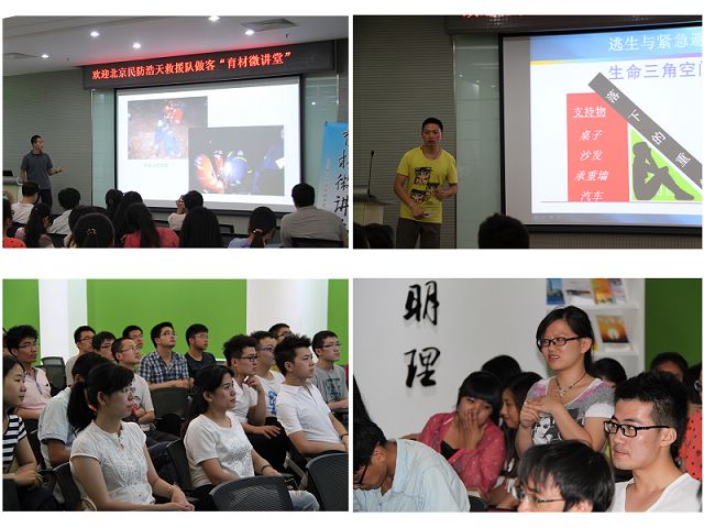 此次“育材微讲堂” 的主讲嘉宾是浩天救援队的外联“冷海”和教官“小武警”,他们都是80后,没有耀眼的光环,但他们却以高尚的人格魅力和专业的知识深深感染了每一位听众。活动伊始,“冷海”同志通过一张张救援照片和一段段视频为大家介绍了浩天救援队参与的各项救援活动。无论是在地动山摇的芦山,还是在洪水肆虐的抚顺,只要有危险,他们就会出现,利用专业救援技能解危扶困。虽然画面不精美,但却足以令人震撼,同学们震撼于救援的艰辛,感动于救援的自发性。随后,“小武警”同志结合自己多次抗震救灾的经历,向同学们普及了专业救援及自救知识。他所分享的各种救援经历,生动的展现了灾难的无情与志愿者们的大爱,给了学生们最强烈的震撼。当电视、网络上常常见到的志愿者出现在学生面前,讲着那些挽救生命的故事,同学们动容了,一次次报以热烈的掌声。在交流环节,大家纷纷提问,曾经历过地震灾难的同学感同身受,噙着泪水与救援队进行交流。