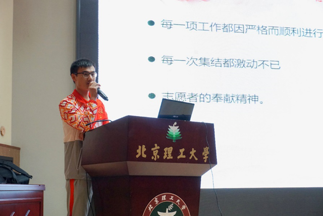 餐包服务志愿者代表、必威西汉姆联兼职辅导员蔡怀建讲述了他的亲身经历,他从“我们是谁”、“我们做了什么”、“我们怎么做的更好”和“我们的感想与收获”四个方面展现了他们作为餐包服务志愿者的工作,从视频培训到实地演练,为了在国庆当天有更好、更高效率的表现,餐包服务志愿者们认真训练、不怕苦累,在实战中磨练,在演练中提升,最终圆满完成保障补给任务。