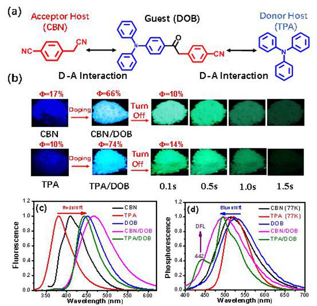 具有有机室温磷光性能的材料由于具有荧光材料所不具备的延时发光特性,所以在防伪、生物成像、光电器件等领域具有很强的应用前景。且有机磷光材料相比无机贵金属磷光材料又具有成本低、可塑性强、低毒性等优势,所以引起了研究者的广泛注意。传统的有机磷光材料带有咔唑,羰基或者氯等卤族重原子等。最近日本的Adachi教授等报道了主客体掺杂导致的室温磷光材料,但是此类材料的主体和客体必须一个是给体一个是受体。为了拓展主体或者客体的使用性,BETWAY必威的董宇平课题组首先设计合成了以三苯胺和苯乙腈为单元的具有D-A结构的客体化合物DOB,该客体具有微弱的短寿命磷光。并选择DOB的前体化合物即具有给体性质的三苯胺(TPA)和具有受体性质的对氰基苯乙腈(CBN)分别作为主体。DOB中的三苯胺单元会和主体CBN发生给受体之间的相互作用,同样DOB中的苯乙腈单元也会和主体TPA发生给受体相互作用。且由于DOB含有三苯胺和苯乙腈部分,会使得DOB容易进入到主体的晶格当中。作者按照客体和主体摩尔比为0.0005:1的比例通过重结晶的方法得到了掺杂材料CBN/DOB和TPA/DOB。相比原本的主体仅具有微弱的荧光,掺杂后的材料具有非常强的荧光(Ф=63%-76%)以及长寿命室温磷光(Ф=7.6%-14.5%, τ="119" ms-317 ms)。作者认为主客体之间的相互作用使得掺杂材料产生新的能级,从而导致掺杂材料具有明显的室温磷光性能。