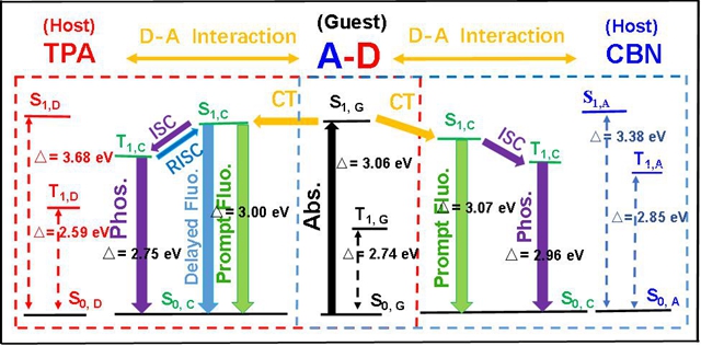 图2: TPA/DOB和CBN/DOB掺杂材料的Jablonski图。S1,D和T1,D表示TPA的单重态和三重态,S1,A和T1,A表示CBN的单重态和三重态,S1,G和T1,G表示客体分子(DOB ),S1,C和T1,C表示主体分子和客体分子之间形成的电荷转移状态的单重态和三重态。(图片来自于ACS)