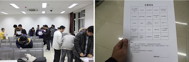 答辩期间,辅导员常云鹏带领大家做了“征集签名”的素质拓展游戏,在一个5X5的表格里分别对应一个条件,每人拿有一份表格按照不同条件在班级内找符合该条件的同学,使同学彼此之间更加了解,增进同学之间的交流,方便大家找到有共同兴趣爱好的同学。