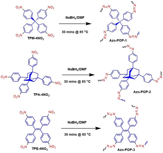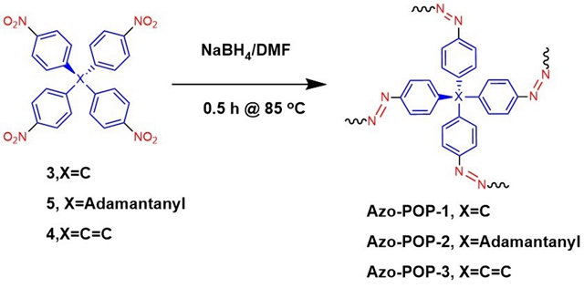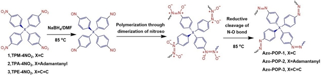 最近,黄木华课题组利用NaBH4介导的还原偶联反应,从多硝基芳香化合物单体出发,实现了偶氮键链接的有机多孔聚合物材料Azo-POP-1, Azo-POP-2和Azo-POP-3的快速制备(图一)。