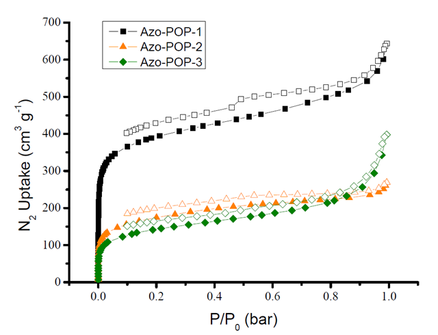 图二 Azo-POP-1, Azo-POP-2和Azo-POP-3的N2吸附等温线图(77 K)