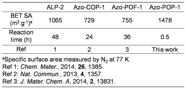 其中,Azo-POP-1的BET比表面积高达1478 m2.g-1(图二),比其它制备条件得到的同类型有机多孔聚合物(ALP-2,Azo-COP-1和Azo-POF-1)明显提高。制备时间只需要0.5小时,比传统制备方法需要的24-48小时大大缩短(表一)。
