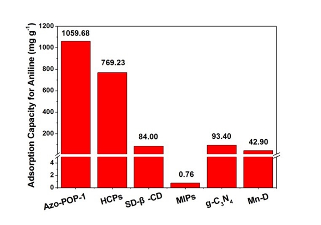 图五 Azo-POP-1与已知多孔材料对苯胺的吸附性能比较