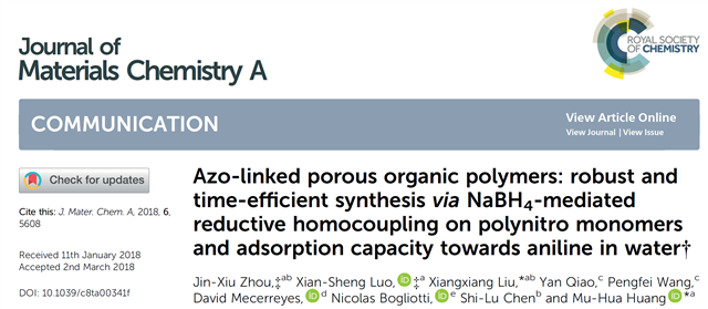 该工作发表在Journal of Materials Chemistry A (Azo-linked porous organic polymers: robust and time-efficient synthesis via NaBH4-mediated reductive homocoupling on polynitro monomers and adsorption capacity towards aniline in water, 2018, 6, 5608–5612, DOI: 10.1039/C8TA00341F) (SCI顶级期刊,影响因子8.867)上。本科生周瑾修和罗贤升为该论文的共同第一作者,黄木华及其博士后刘向向为通讯作者。该工作得到了国家自然科学基金(No. 21772013 and 21202008)、北京市自然科学基金(No. 2162039)以及中央高校基本科研业务费专项基金的大力资助。同时,该工作也得到了必威西汉姆联分析测试中心(筹)的大力支持。