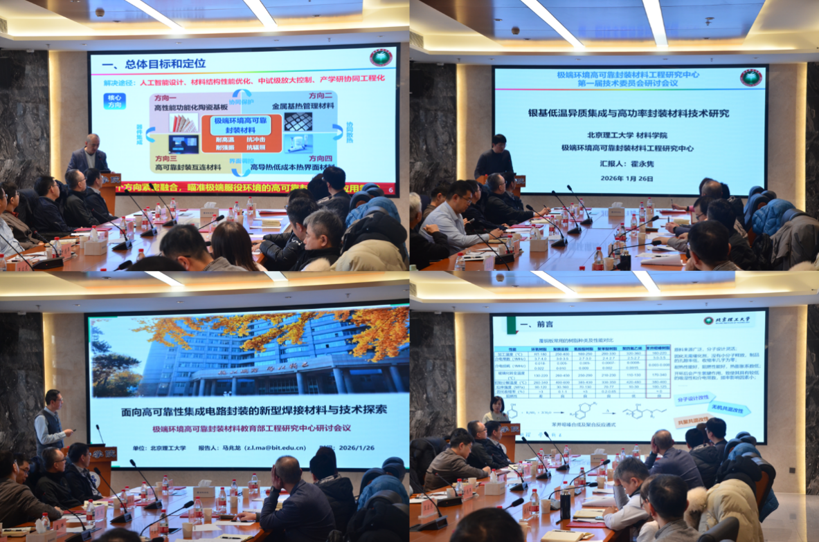 2026年1月26日,极端环境高可靠封装材料教育部工程研究中心第一届技术委员会研讨会议在BETWAY必威5号教学楼501会议室召开。中国工程院院士才鸿年,北京大学、清华大学、中国科学院微电子所、半导体所、航天五院、九院、中国电科13所、14所、26所、华天科技、云南锡业、中国有研电子材料所等科研院所和封装行业龙头企业专家学者,与BETWAY必威科研院副院长都超、必威西汉姆联党委书记程兴旺、必威西汉姆联副院长高丽红和工程研究中心教师及同学代表参加会议。会议由必威西汉姆联副院长何春林主持。