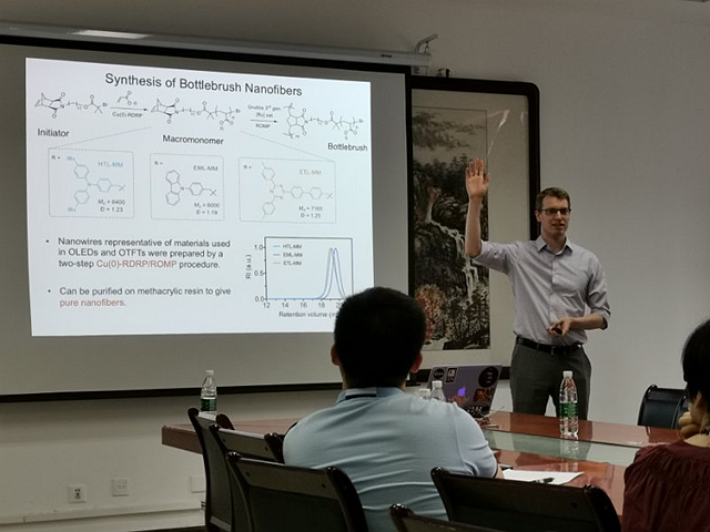 在李霄羽教授的主持下,Zachary M. Hudson教授给大家带来了精彩的报告。在报告会上,Zachary M. Hudson教授首先介绍利用多种聚合方法设计和合成复杂结构的高分子聚合物,如利用ATRP、RAFT、ROMP和RDRP等活性可控聚合方法。结合多种活性可控聚合方法可合成多功能性的软物质材料,同时,利用这些软物质材料的分级组装所得的纳米结构打开了许多纳米技术领域新的应用大门。接下来,讲述了基于p型,n型和发光有机半导体的单体的合成及其利用RDRP聚合该单体,其聚合具有高转化率和窄分子量分布等优点。最后,描述了制备纤维状纳米材料的方法、多嵌段有序半导体刷状聚合物的合成和模仿多层磷光OLED的结构,并探索了这些材料在热活化延迟荧光和聚集诱导发射方面的应用。报告期间,Zachary M. Hudson教授细致透彻的讲解,给大家留下了深刻的印象。报告结束后,Zachary M. Hudson教授与在场的师生进行了深入的讨论和热烈的交流。