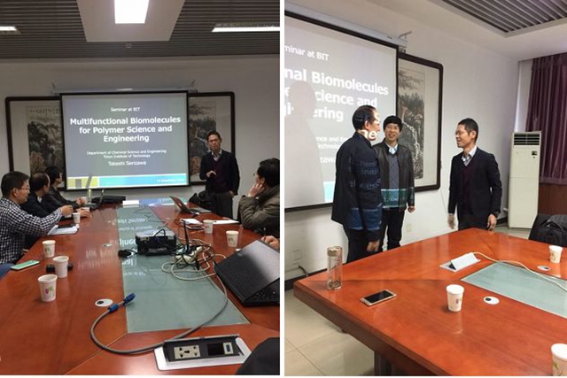 2016年12月14日,应必威西汉姆联北京市纤维素及其衍生材料工程技术研究中心邀请,日本东京工业大学(Tokyo Institute of Technology)物质理工学院应用化学系Takeshi Serizawa教授访问必威西汉姆联,并做了题目为“Multifunctional Biomolecules for Polymer Science and Engineering”的学术报告。必威西汉姆联党委书记张青山教授,院长助理张加涛教授,工程中心负责人邵自强教授,以及学院和工程中心其他老师和研究生们参加了此次报告会。