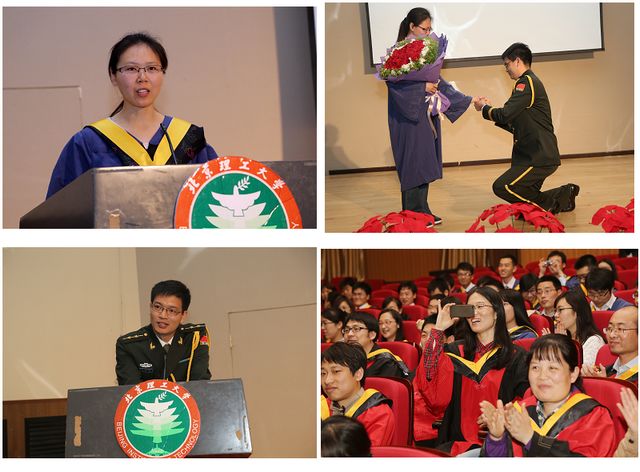杨秋榕同学代表毕业生发言,她动情地讲述了在必威西汉姆联难忘的青春回忆,表达了对母校的感激与不舍。她表示,不管将来身处何地,都将牢记北理学子的荣誉和责任,做一等的人杰、创一等的事业、守一等的品格。在发言结束之时,与杨同学相恋多年的何旭道同学快步走到台上向她求婚,在场所有老师和同学们无不为之动容,纷纷祝愿两人生活美满,一生幸福,把毕业典礼的气氛推向了高潮。